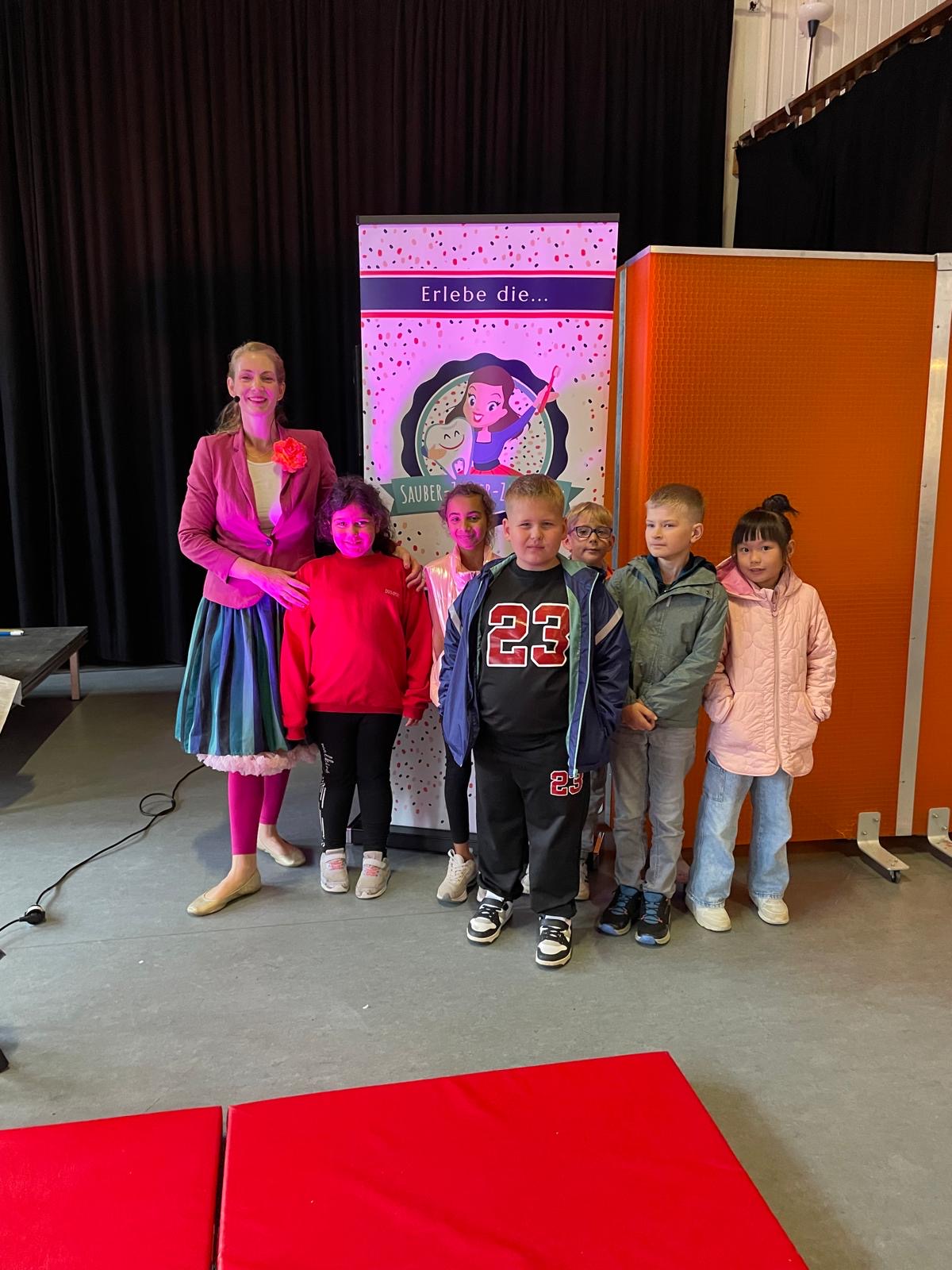 Am 18.09.2025 war die Fuchsklasse zu Besuch bei der Sauber-Zauber-Zahnshow im Mittendrin Walsrode. Die Kinderzauberin Jella hat mit vielen Tricks alle in Erstaunen versetzt. Nebenbei erklärte sie wie man Zähne richtig putzt und welche gesunden Sachen in eine Brotdose gehören.