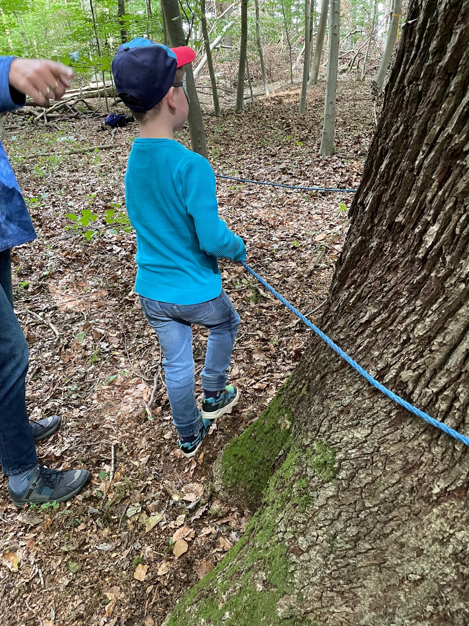 Der Wald fühlt sich ganz anders an, wenn man sich die Augen verbindet. Zum Glück gab es ein Seil, an dem wir uns festhalten konnten.